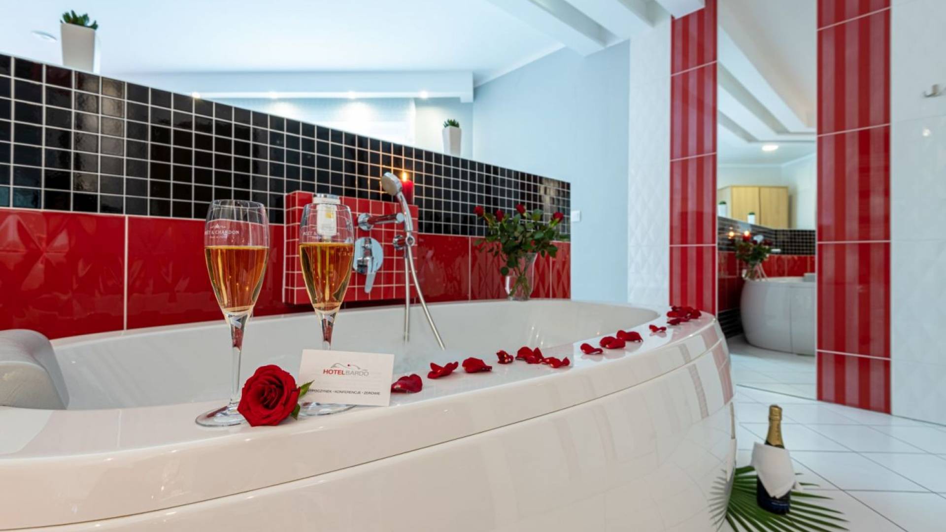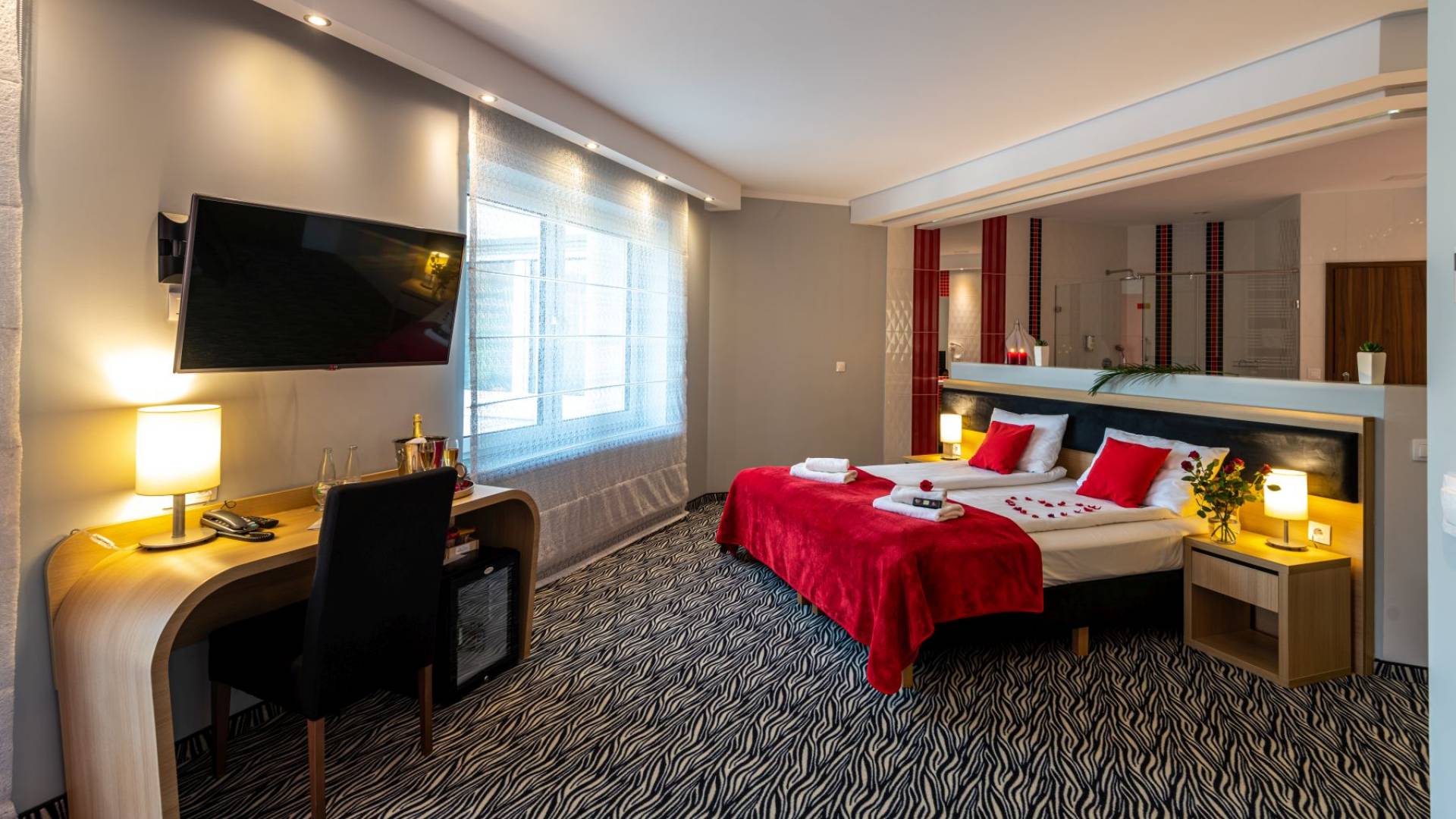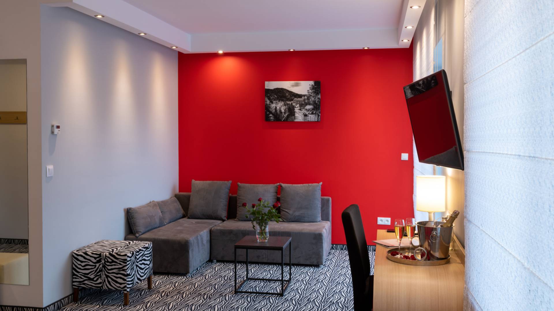 Studio Deluxe z otwartą łazienką o powierzchni 38m2. W pokoju znajduje się łóżko łączone specjalną nakładką o wymiarach 180x200m. Otwarta łazienka z wanna, prysznicem oraz osobną toaletą. W pokoju znajduje się rozkładana kanapa. W każdym pokoju znajduje się woda mineralna, monitor smart TV, minibarek, suszarkę, kosmetyki hotelowe, wifi, telefon.